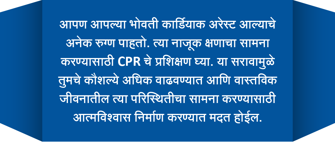आता तुम्ही CPR प्रशिक्षण पूर्ण केले आहे, तुम्हाला कार्डियाक अरेस्टच्या रुग्णांचे प्राण वाचवण्याचे कौशल्य प्राप्त झाले आहे .